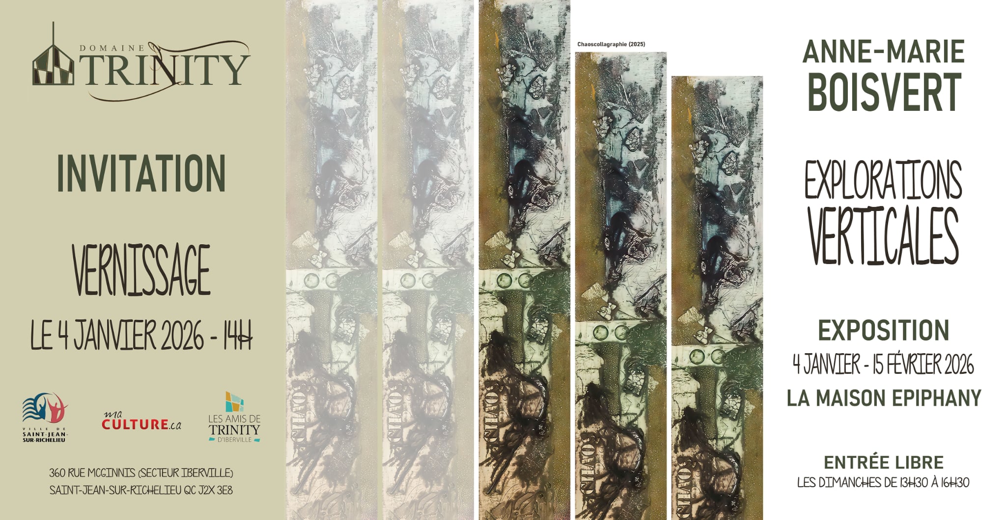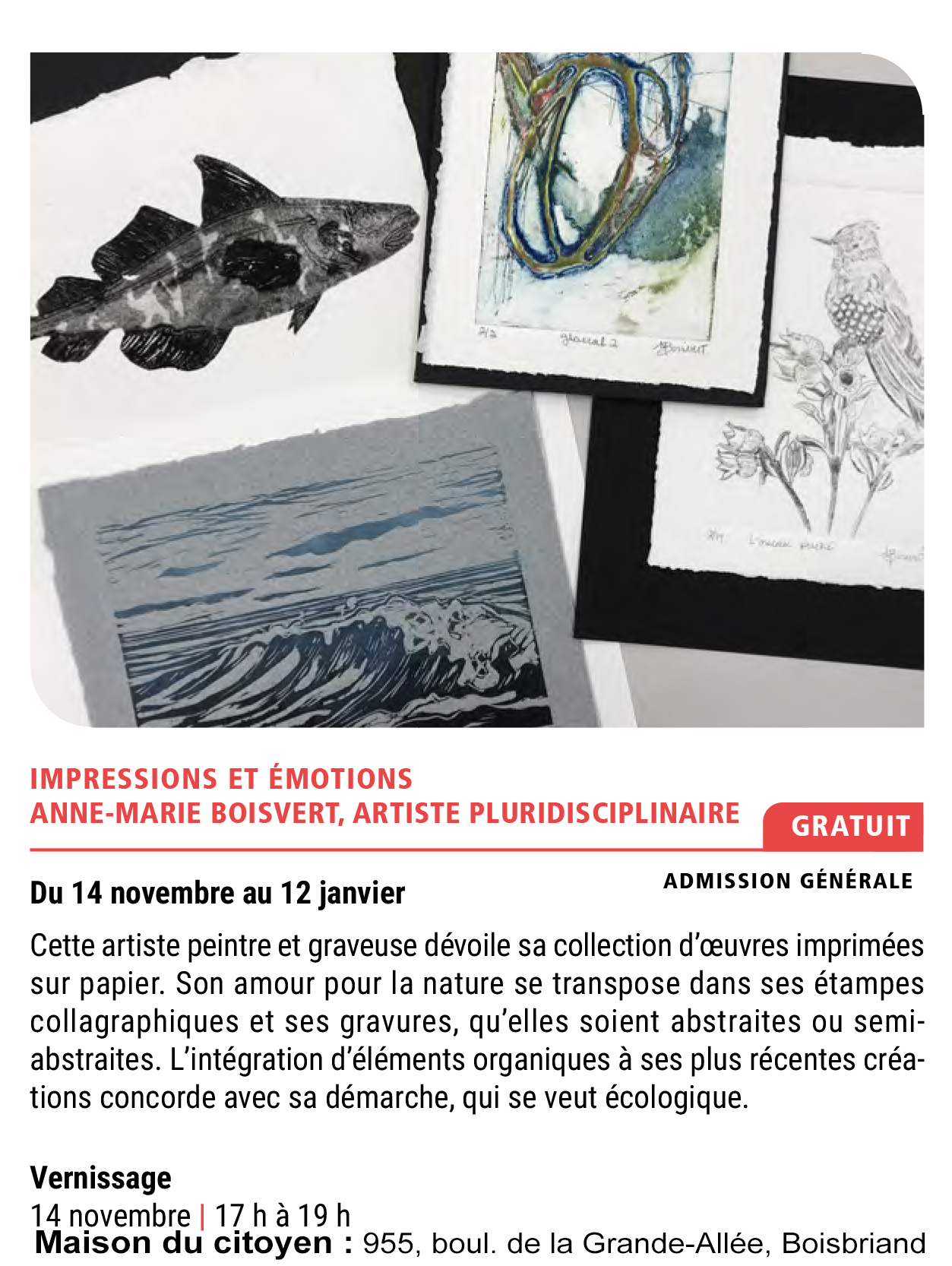 Exposition Maison du citoyen 14 novembre 2025/ 12 janvier 2026 Impressions et émotions Anne-Marie Boisvert…