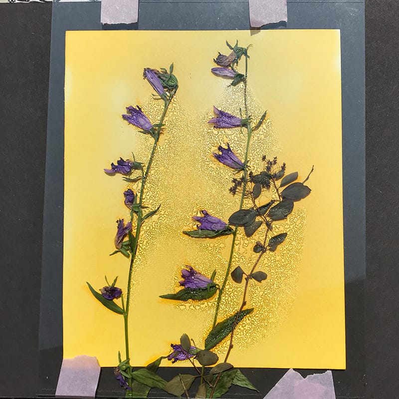 Sortez un seul papier à la fois, déposer les végétaux soigneusement sur le papier aquarelle imprégné de la solution alcool et curcuma. Déposer le verre par-dessus, pincer le tout avec des pinces afin de bien aplanir le tout.