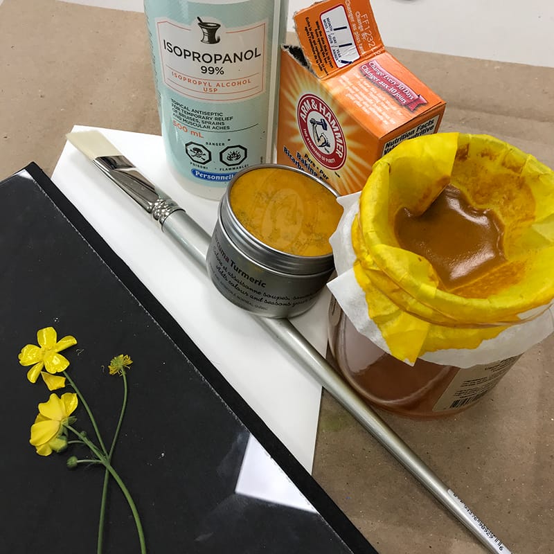 Poudre de curcuma, alcool à friction ou isopropanol, filtre de papier, basin d’eau avec du bicarbonate de soude, papier aquarelle, pinceau, contenant en verre, verre, pinces et carton pour l’exposition au soleil.