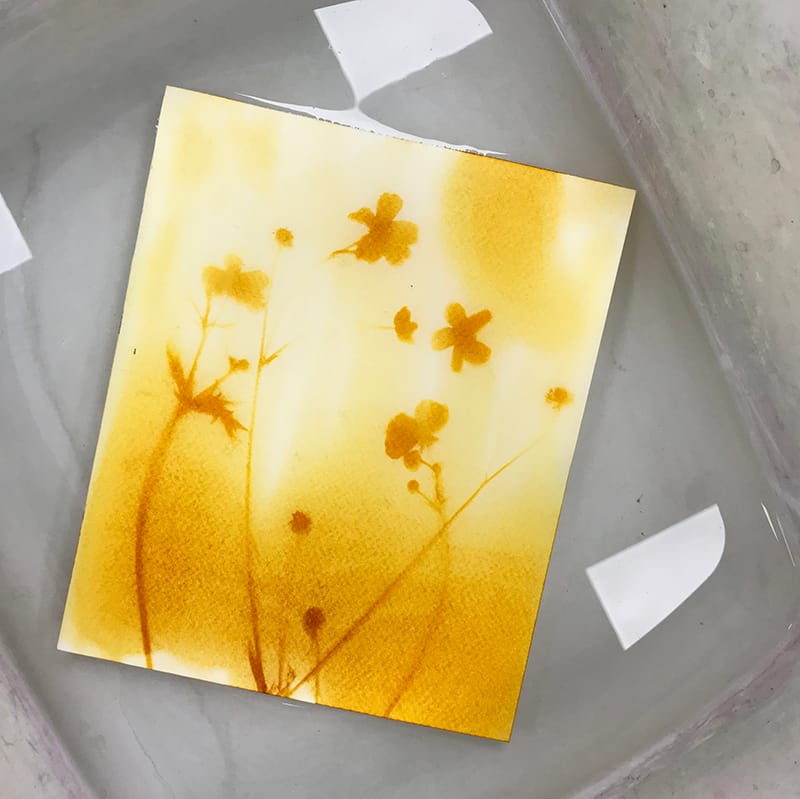 Une fois la période d’exposition terminée, rincer le papier dans le bassin d’eau et de bicarbonate de soude. L’impression se révèlera plus foncée et deviendra plus brunâtre lors du séchage.