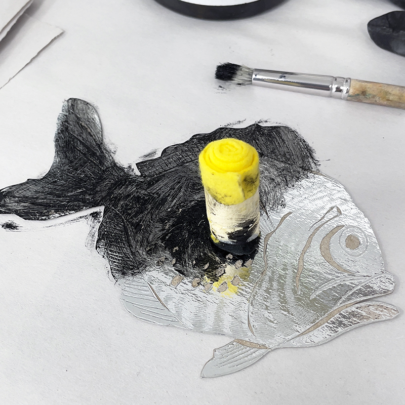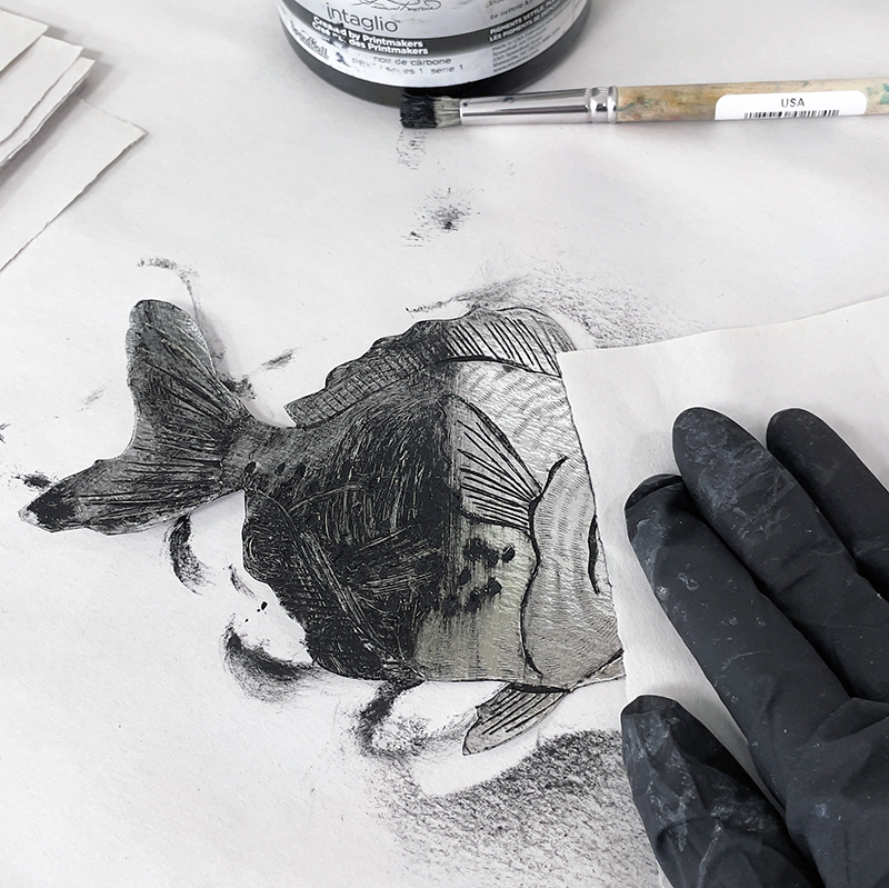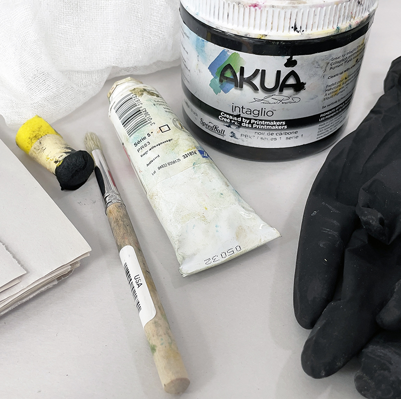Concernant le choix de votre encre, il existe maintenant des encres à l’huile solubles à l’eau. Elles sont bien agréables à utiliser. Personnellement mon choix c’est arrêté sur l’encre AKUA fait à base de soya. Elle est plus malléable que les encres traditionnelle et donc plus facile à étendre sur les matrices, de plus le lavage des outils et surfaces se fait facilement avec de l’eau et savon pour la vaisselle.