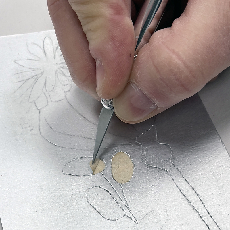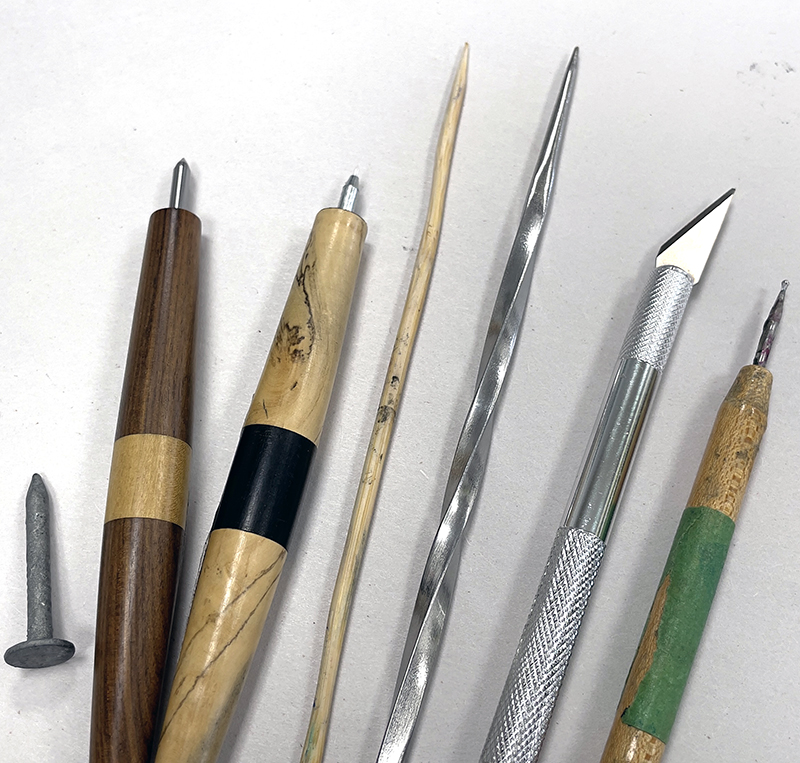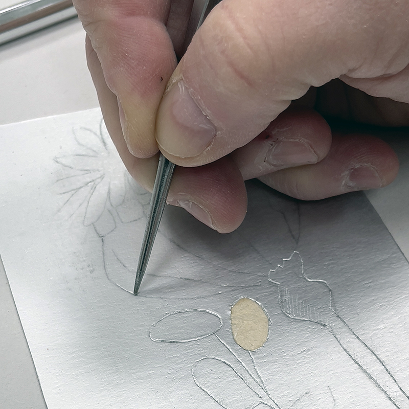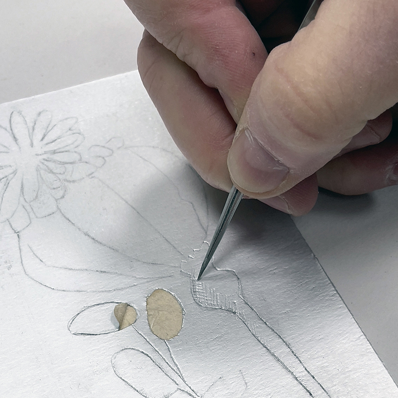 Le tétrapack se grave très facilement avec un outil pointu tel que clou, pointe sèche et même un bâtonnet (brochette) de bois couramment utilisé en cuisine. On peut aussi varier la porosité de la surface en appliquant des médiums acryliques et utiliser un exacto de précision pour peler des espaces afin de retirer délicatement la pellicule métallisée; créant ainsi un espace plus poreux sur laquelle adhérera davantage l’encre.