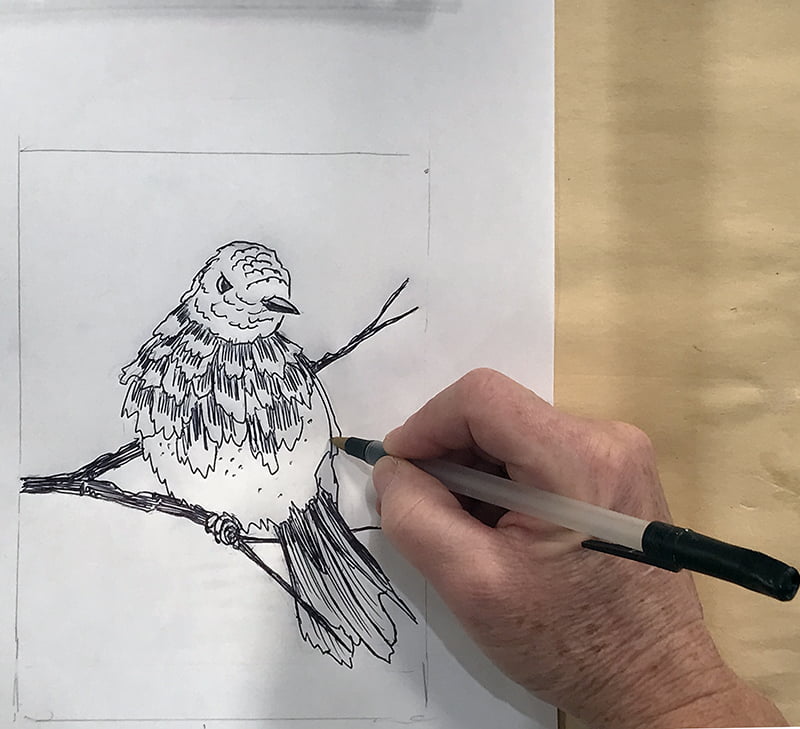 Dessiner votre dessin au stylo bille en pressant fermement afin de graver la feuille; pour un meilleur résultat j’exécute cela en déposant ma feuille sur une tablette de papier qui absorbera et facilitera le tout (plusieurs épaisseurs de feuilles en dessous du dessin fera l’affaire).