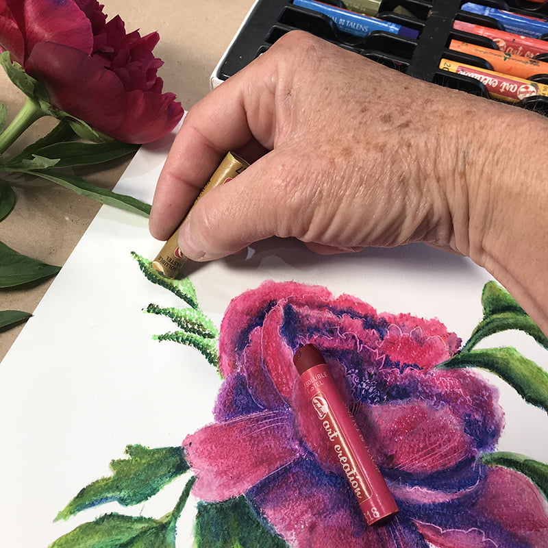 A noter, les pastels à l’huile sont propices pour les techniques de sgraffite, il suffit de graver délicatement les couleurs avec un outil avec un embout pointue.